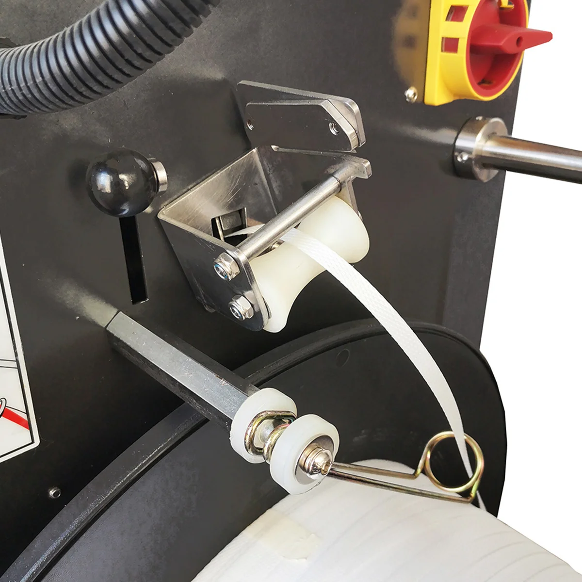 Makinë automatike për lidhjen e paketave me rripa (strapping), dizajnuar për volum të punës mesatar deri të lartë. Ajo përdor motorë DC për çdo funksion kryesor, duke reduktuar komponentët mekanikë dhe duke përmirësuar efikasitetin. Pajisja ka panel kontrolli të rrotullueshëm 180°, që lejon operim nga të dy anët e makinës, dhe një pedal për nisjen e ciklit të lidhjes, duke e bërë ideale për linja prodhimi ose paketim industrial.