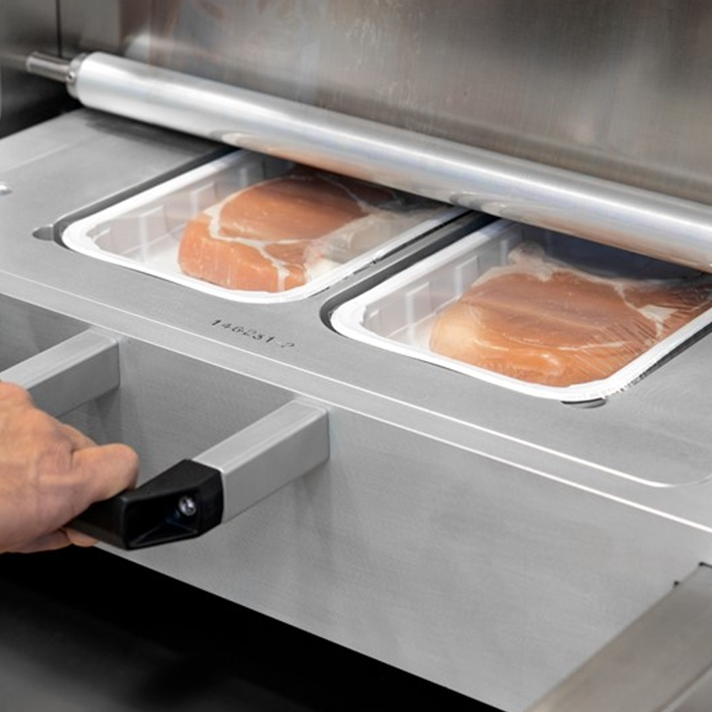 Makinë automatike për paketim ushqimi në kuti plastike që kryen tre hapa në një cikël të vetëm: heq ajrin (vakum), mbush kutinë me gaz inert për të ruajtur freskinë dhe aromën (Atmosferë e Modifikuar – MAP) dhe saldon filmin hermetik për të mbyllur kutinë plastike duke rritur jetëgjatësinë dhe cilësinë e ushqimit. E përshtatshme për restaurante, catering, gastronomi dhe industri ushqimore.