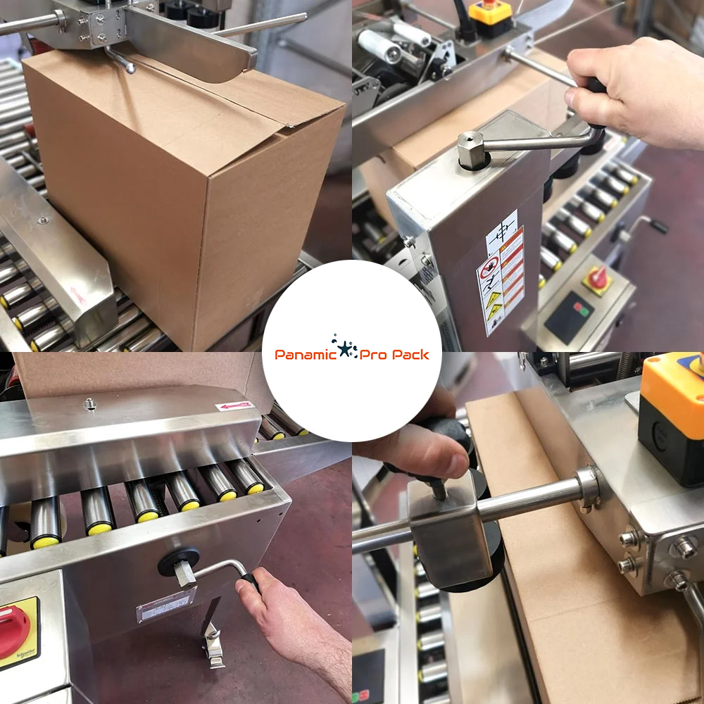 E ndërtuar plotësisht në çelik inox, e pajisur me sistem autodimensionimi që përshtat automatikisht madhësinë e kutisë gjatë ciklit të punës, pa rregullime manuale. Ajo siguron mbyllje të sipërme dhe të poshtme të kutive me përmasa të ndryshme në mënyrë të shpejtë, të saktë dhe të qëndrueshme