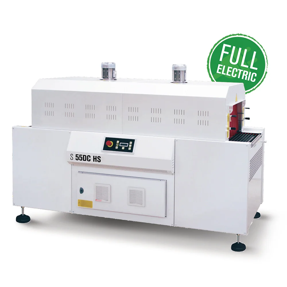 Tunel termoretraíble me dy kamera, që ofron kontroll më të mirë të procesit të tkurrjes për rezultate uniforme të paketimit. Kontroll i pavarur i shpejtësisë së transportit dhe temperaturës, me mundësi memorizimi deri në 10 cikle pune. Sistem kontrolli FLXMOD® me panel LCD alfanumerik, i lehtë për përdorim dhe monitorim të parametrave të punës. Transportuese me rrota siliconesh si standard, për trajtim të qetë të produkteve. Sistem ftohjeje dhe deflektori rregullues i ajrit, për rezultate të finalizimit të paketimit me cilësi të lartë dhe konsum të reduktuar energjie.