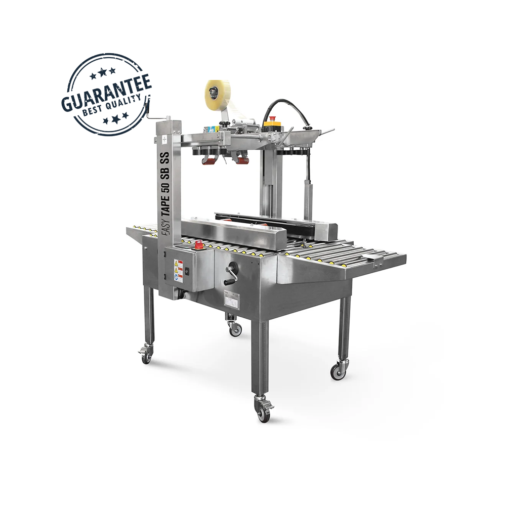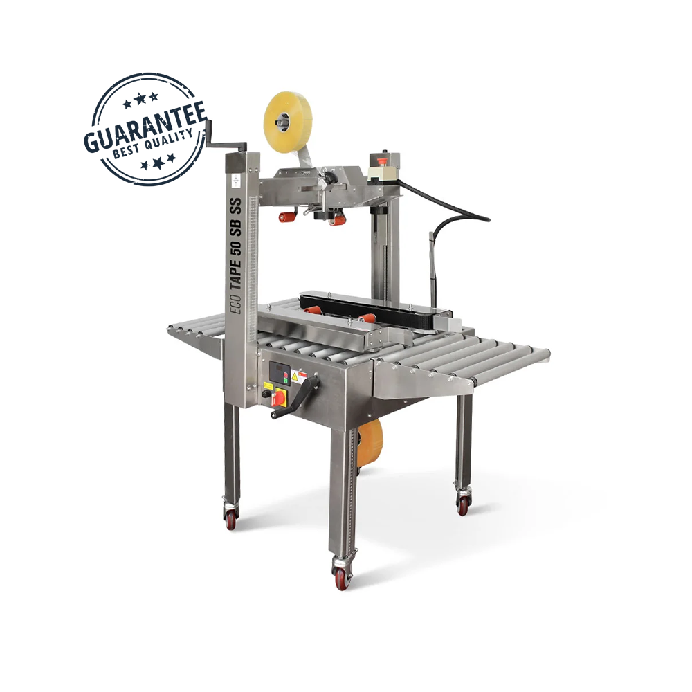 Makinë semi‑automatike për mbylljen e kutive me shirit ngjitës, e ndërtuar plotësisht në çelik inoksi, e projektuar për sigurimin e mbylljes së sipërme dhe të poshtme të kutive me shpejtësi dhe saktësi të lartë. Kjo pajisje është ideale për ambiente ku kërkohen standardet më të larta të higjienës dhe qëndrueshmërisë, si industria ushqimore, farmaceutike dhe kozmetike.