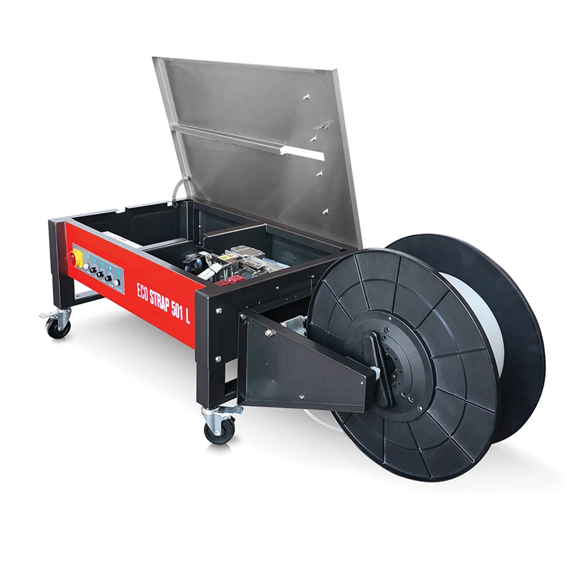 Makinë semiautomatike me tavolinë të ulët e karrocë me rrota, e projektuar posaçërisht për lidhjen e produkteve voluminoze me shirita plastikë. Operatori vendos shiritin rreth produktit dhe makina e tërheq, tensionon dhe e mbyll automatikisht përmes saldimit termik, duke siguruar një paketim efikas dhe të sigurt, pa lodhje për punonjësin.