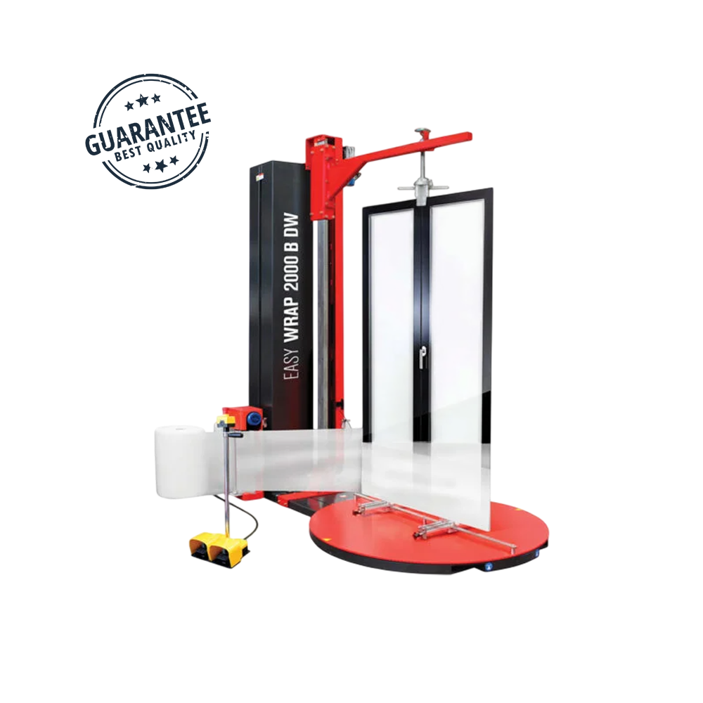 Makinë semiautomatike për mbështjelljen vertikale të dyerve, dritareve, box dushi dhe objekte të larta/vertikale me film stretch dhe materiale mbrojtëse (si foam/bubble). Pajisja është e projektuar për të siguruar paketim profesional dhe mbrojtje maksimale gjatë transportit ose magazinimit.